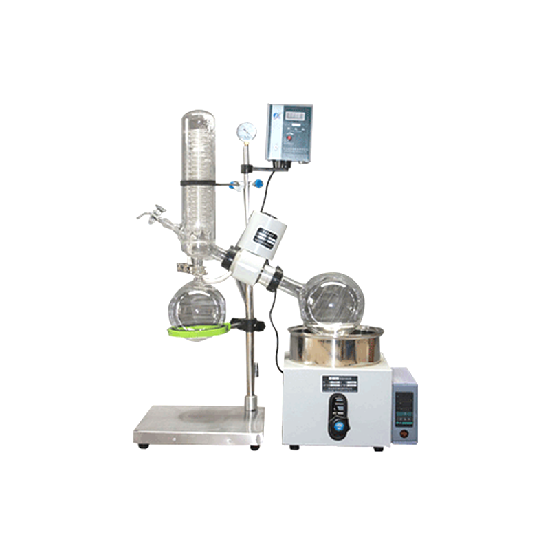 蒸發瓶恒速旋轉,水浴鍋恒溫加熱,在此條件下:物料在蒸發瓶內壁形成大面積均勻薄膜快速蒸發,在真空條件下可以提高蒸發效率(需連接真空裝置),溶媒蒸汽經玻璃冷凝盤管時冷卻成液體(需連接冷卻裝置),回收于收集瓶。