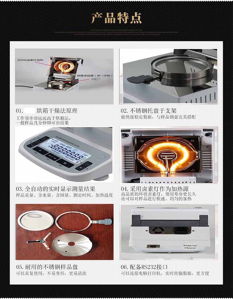 3、快速分析、先進的鹵素燈技術是確保快速加熱和精確溫度控制的關鍵。最終測量結果在最短的時間內得出。